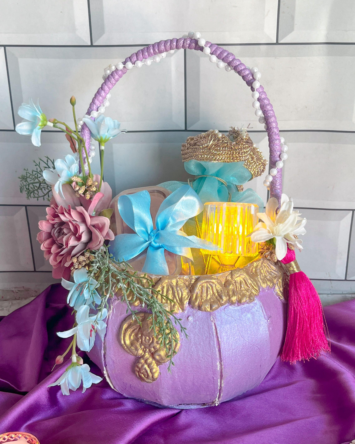 Celebrate Diwali with a hamper that blends health, sweetness & lasting utility – Roasted Almonds, Chocolate Almonds, Raisins, Mini Dry Fruit Teacake, a Stylish Table Lamp, Reusable Decorated Handi & a heartfelt Greeting Card.