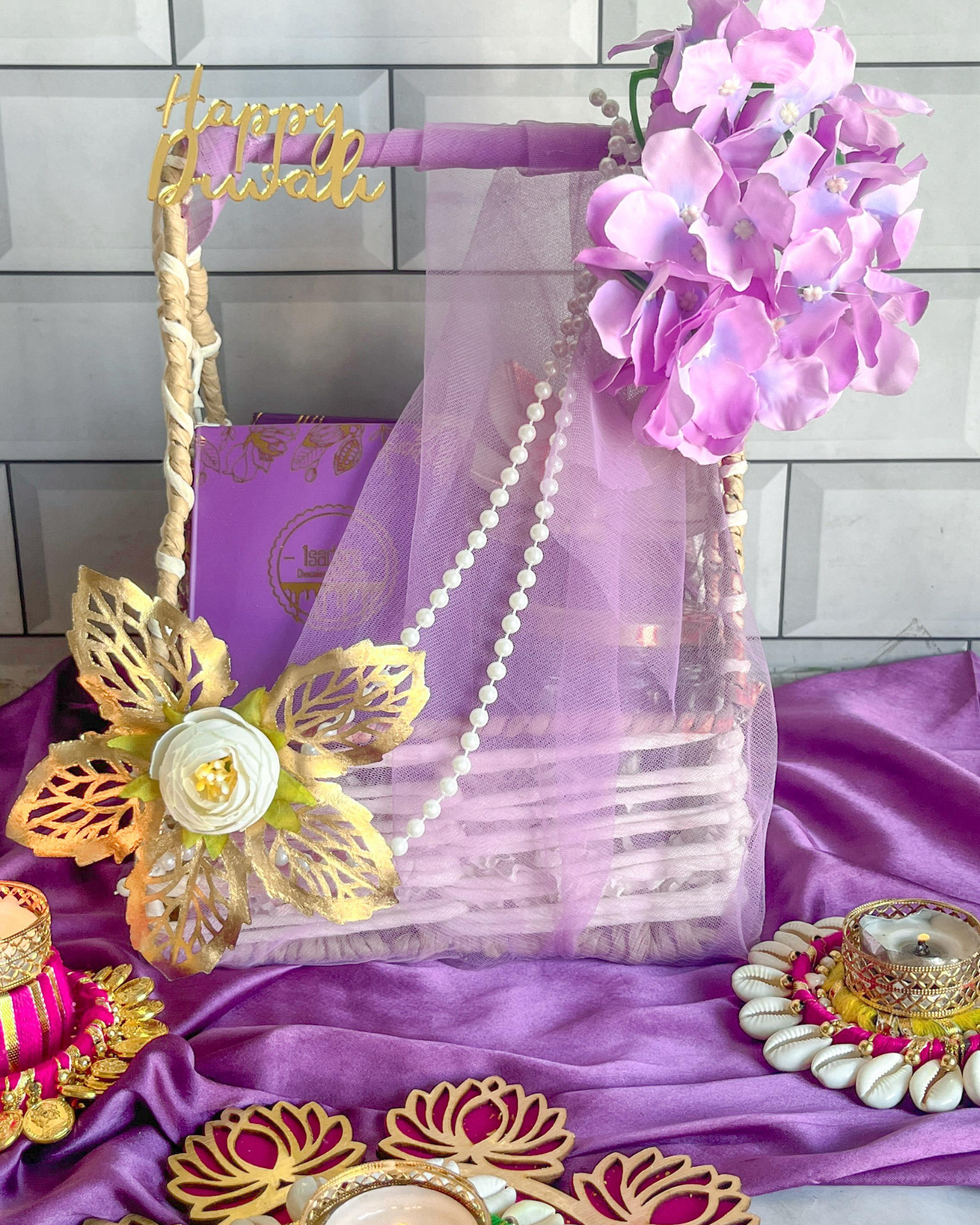 A thoughtfully curated hamper featuring Assorted Artisanal Chocolates, Gourmet Cookies, a Jumbo Jar of Banana Chips, Golden Lotus Diya with tealight, Diwali Greeting Card, Decorative Tray & 2 Mini Flower Bouquets – the perfect blend of taste, tradition & festive charm.