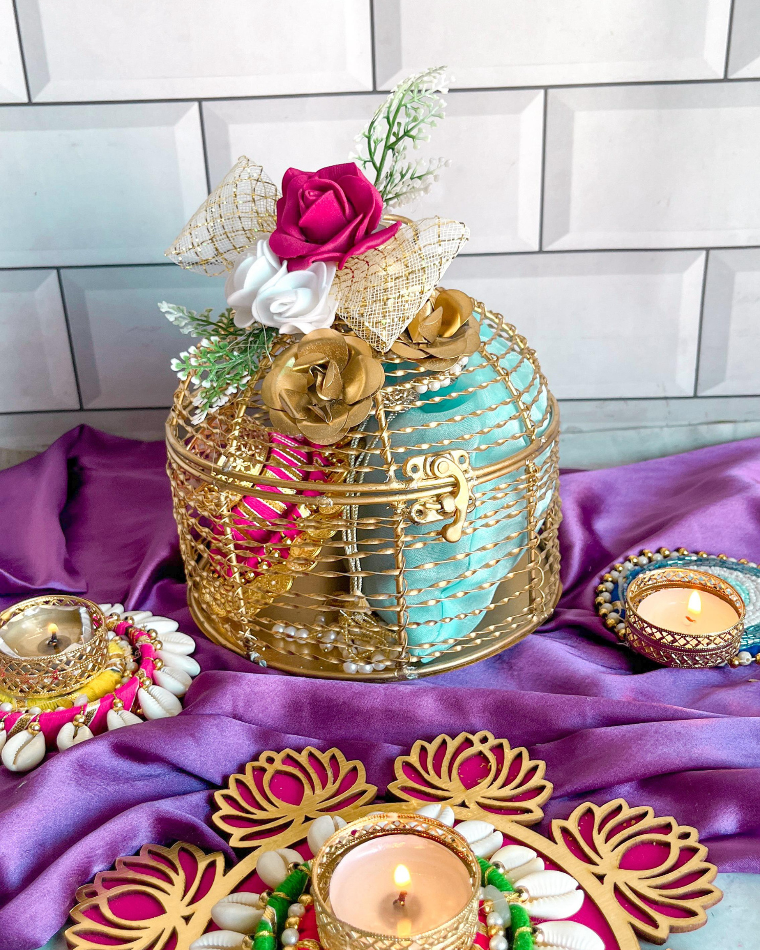 A thoughtful Diwali hamper with the richness of Roasted Almonds, Chocolate Almonds, Raisins, a Mini Dry Fruit Teacake, Handcrafted Diya, Greeting Card & an elegant Cage Storage Box.